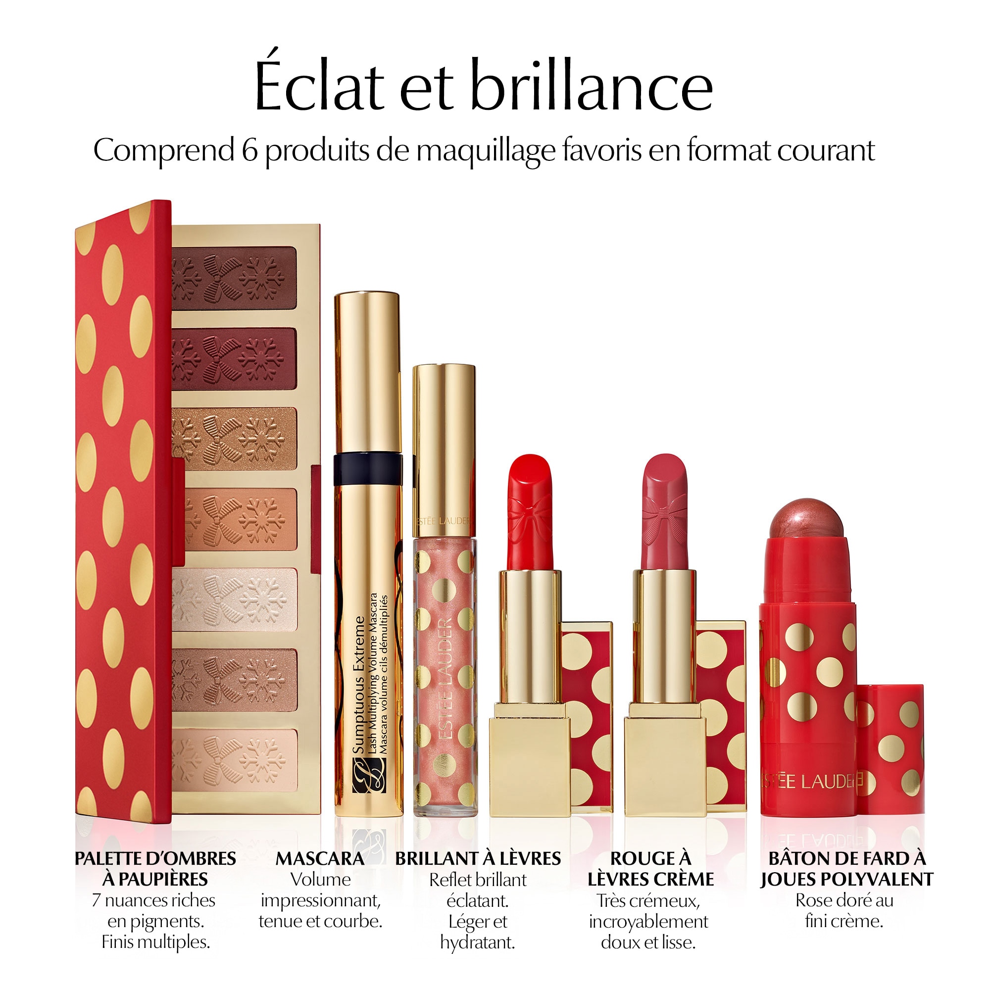 Achetez un Coffret des Fêtes de 12 pièces avec 9 ensemble-cadeau de produits de beauté plébiscités, format courant pour 115 $ avec tout achat admissible de 150 $ sur esteelauder.ca. Les achats admissibles excluent les accessoires de beauté et les produits préférés en format de voyage. Offre valide pour les résidents du Canada seulement. Les quantités sont limitées et l’offre dépend de la disponibilité; jusqu’à épuisement des stocks. Une seule prime par personne. L’offre peut être modifiée ou annulée sans préavis. L’offre ne peut être combinée à aucune autre offre ou remise. Le montant d’achat applicable n’inclut pas : les cartes cadeaux électroniques, les cartes cadeaux, la gravure, les frais d’emballage cadeau, la taxe de vente, la livraison et la manutention, les articles non éligibles ou les articles qui ne sont pas disponibles au moment de l’achat, les achats en attente ou les achats effectués avant le début de l’offre ou après qu’elle se termine. Tous les achats doivent recevoir une autorisation bancaire avant d’être traités. Seuls les achats autorisés seront traités et livrés. Nous nous réservons le droit d’annuler toute commande qui utilise les offres de manière non autorisée, modifiée ou non admissible et de modifier ou d’annuler les promotions si des erreurs de système ou des problèmes imprévus surviennent. D’autres restrictions peuvent s’appliquer.
