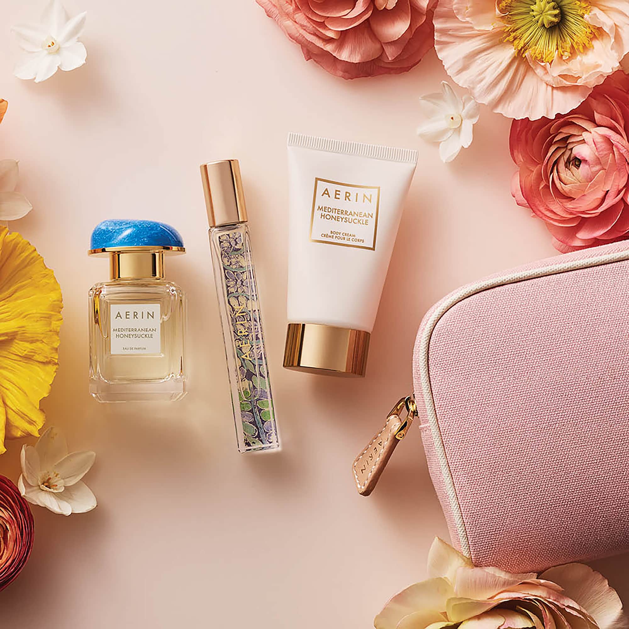 Évadez-vous sur la Riviera italienne avec les essentiels pour l’été d’AERIN Mediterranean Honeysuckle. Disponible dans deux formats, l’un à emporter partout et l’autre adapté à votre trousse, l’Eau de Parfum Mediterranean Honeysuckle est associée à la luxueuse Crème pour le Corps Mediterranean Honeysuckle dans une trousse à cosmétiques en toile couleur rose poudré.